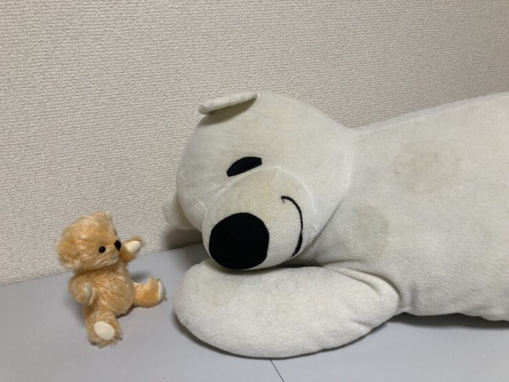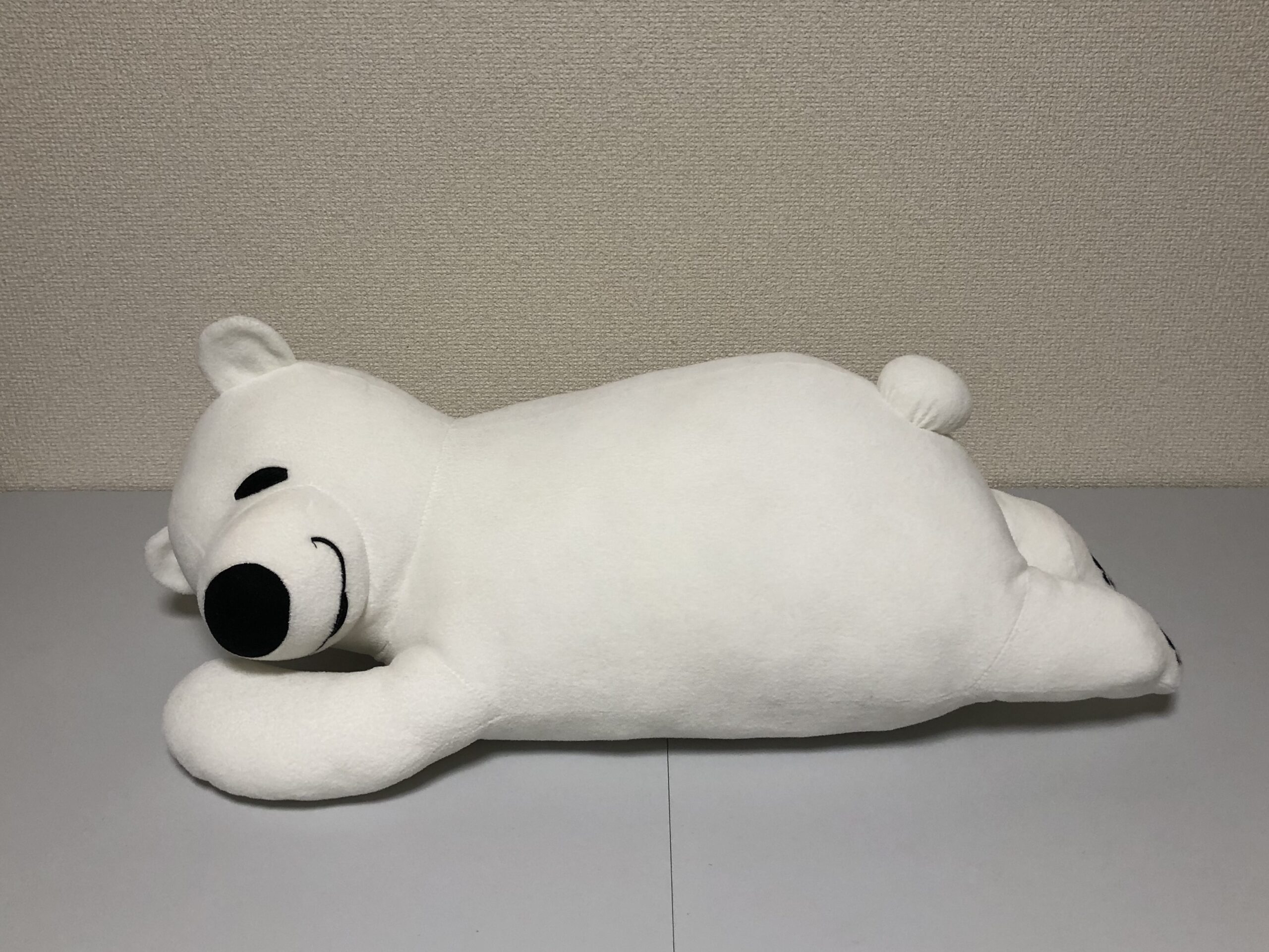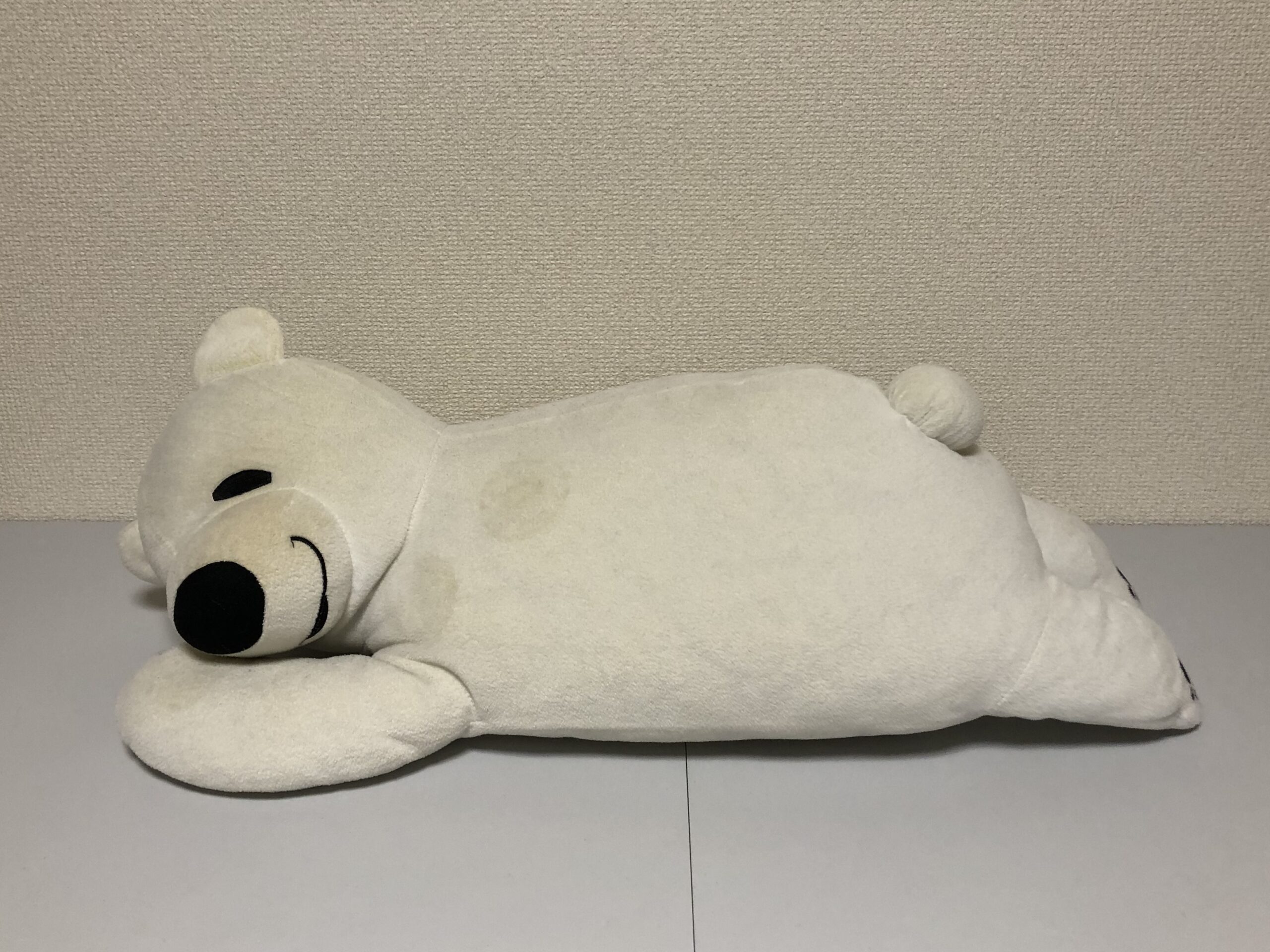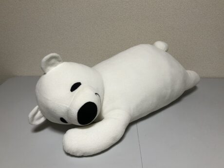 ダイアンぬいぐるみ診療所にやってきた、まったり寝そべり姿が癒し系な「しろくまくん」。