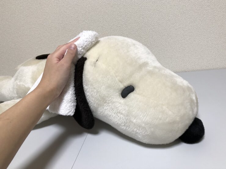 今回のようなタオルで拭くクリーニング方法だと直接は水に浸からないため、元々の中綿が詰まったままでも行うことができます。