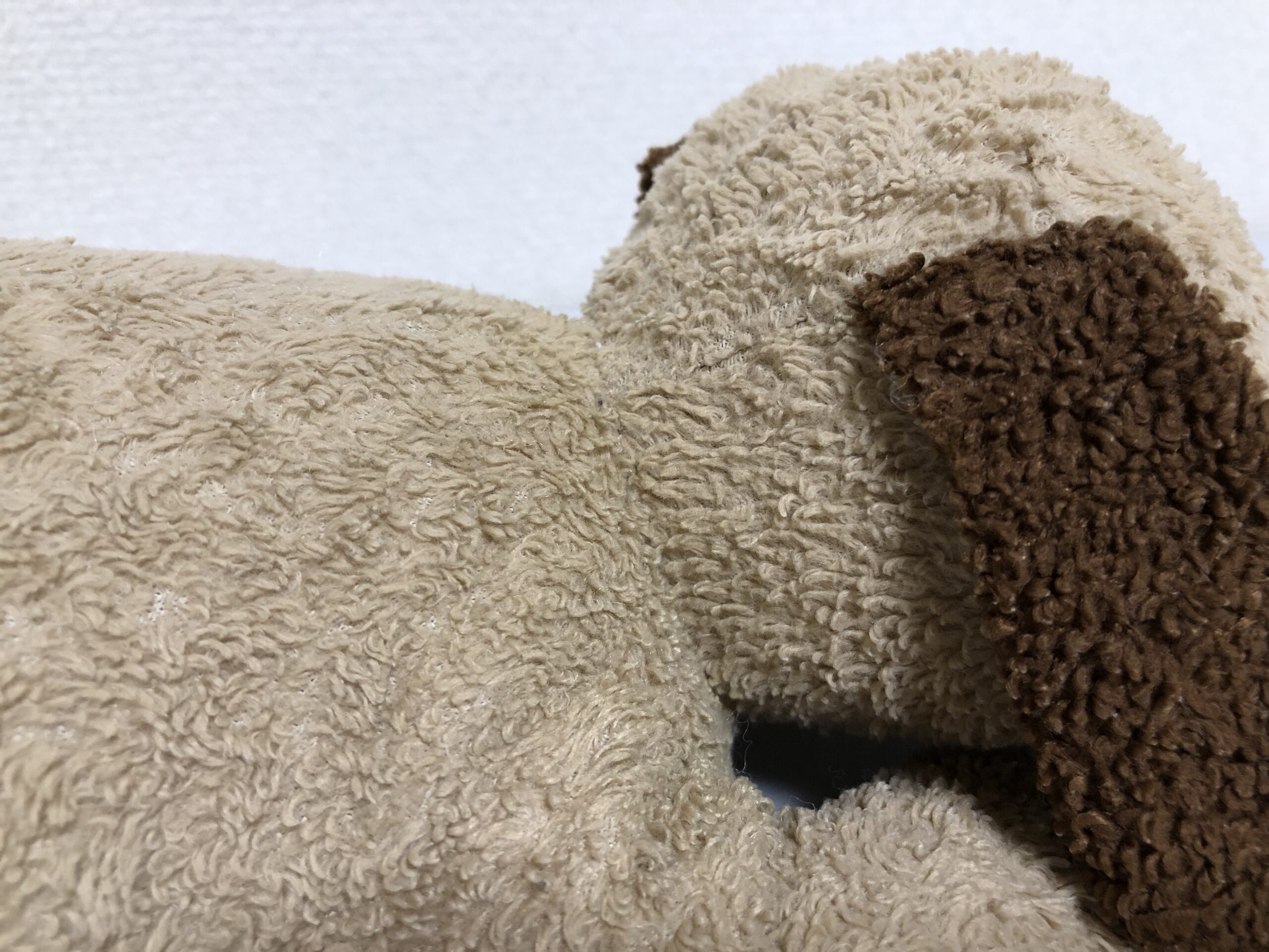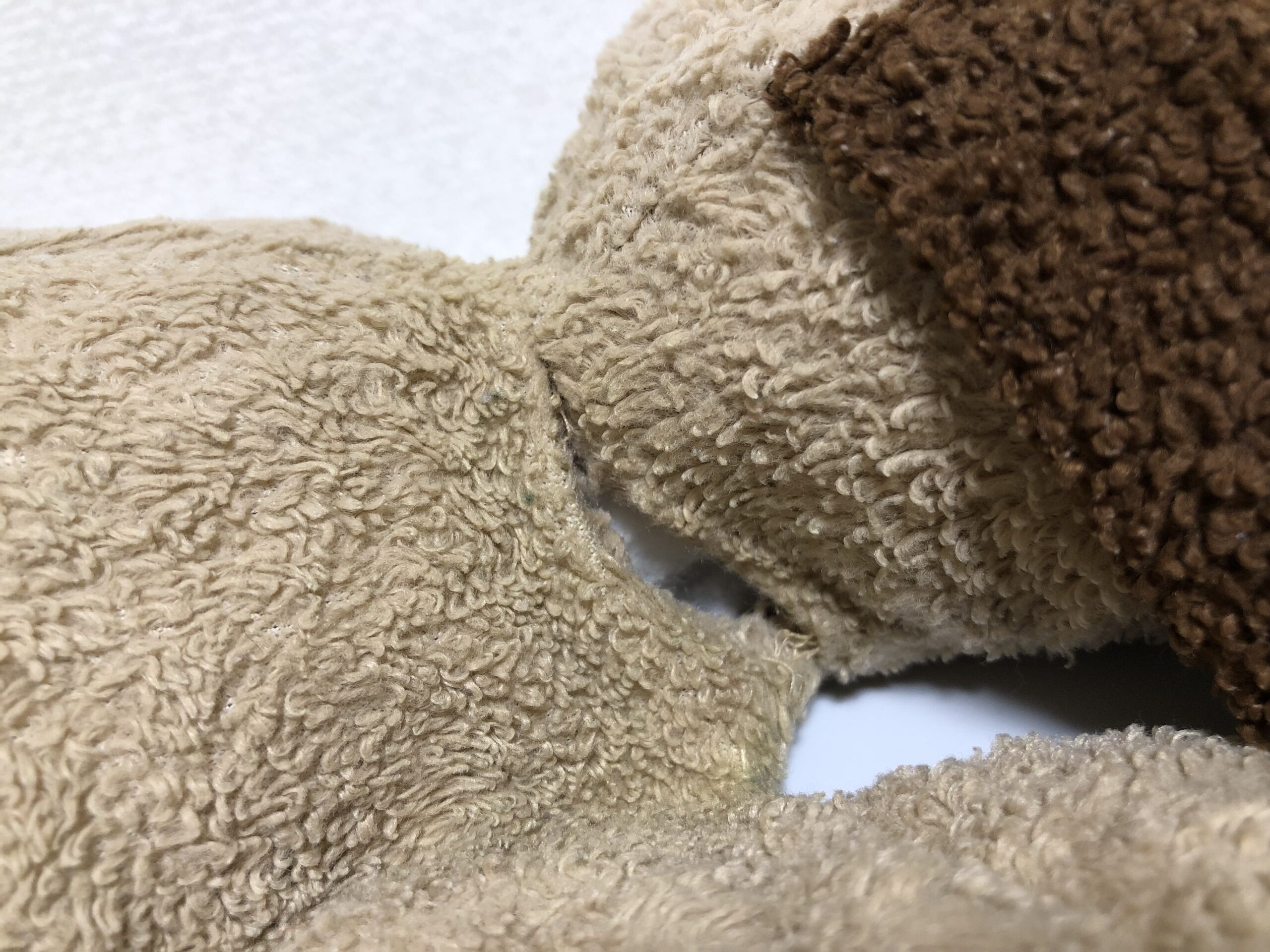 所々に中綿の減りや偏りが見られましたが、新しい中綿を詰め直す治療でふっくら元気に。