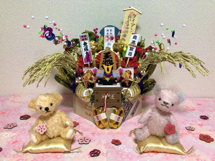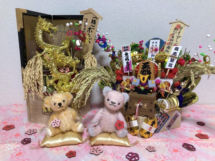 縁起の良さそうなこちらの写真たちは、ダイアンぬいぐるみ診療所の運営元である「株式会社ボンズコミュニケーション」の社長イチカワが、毎年酉の市で入手してきてくれる縁起物とのショットです(笑)。