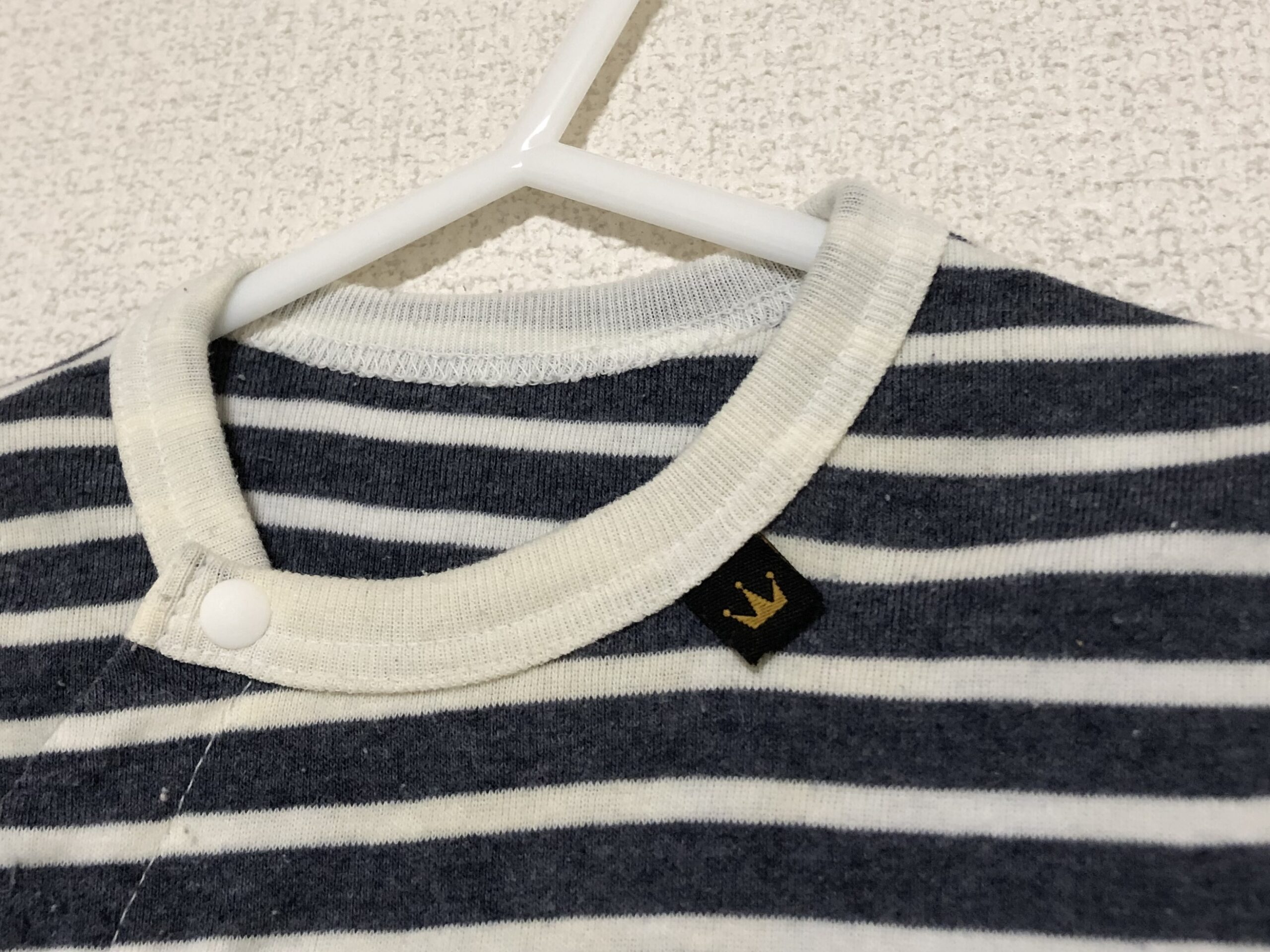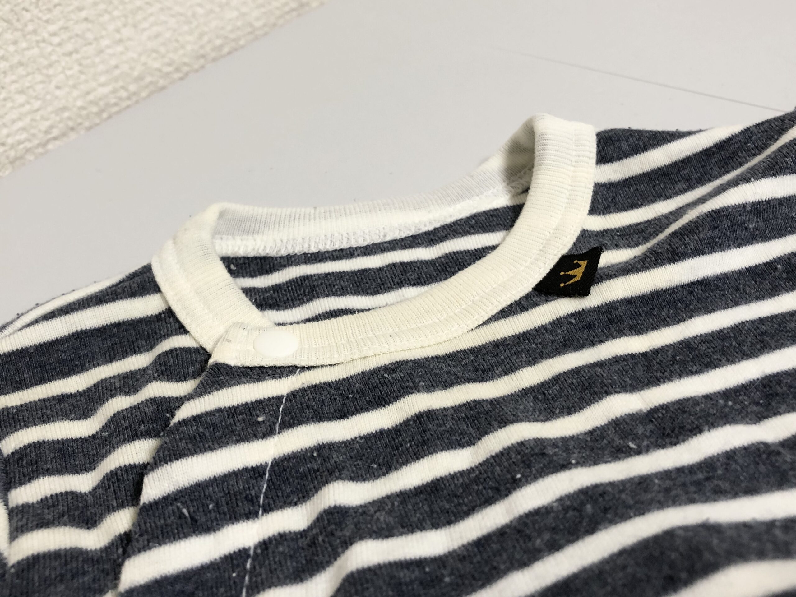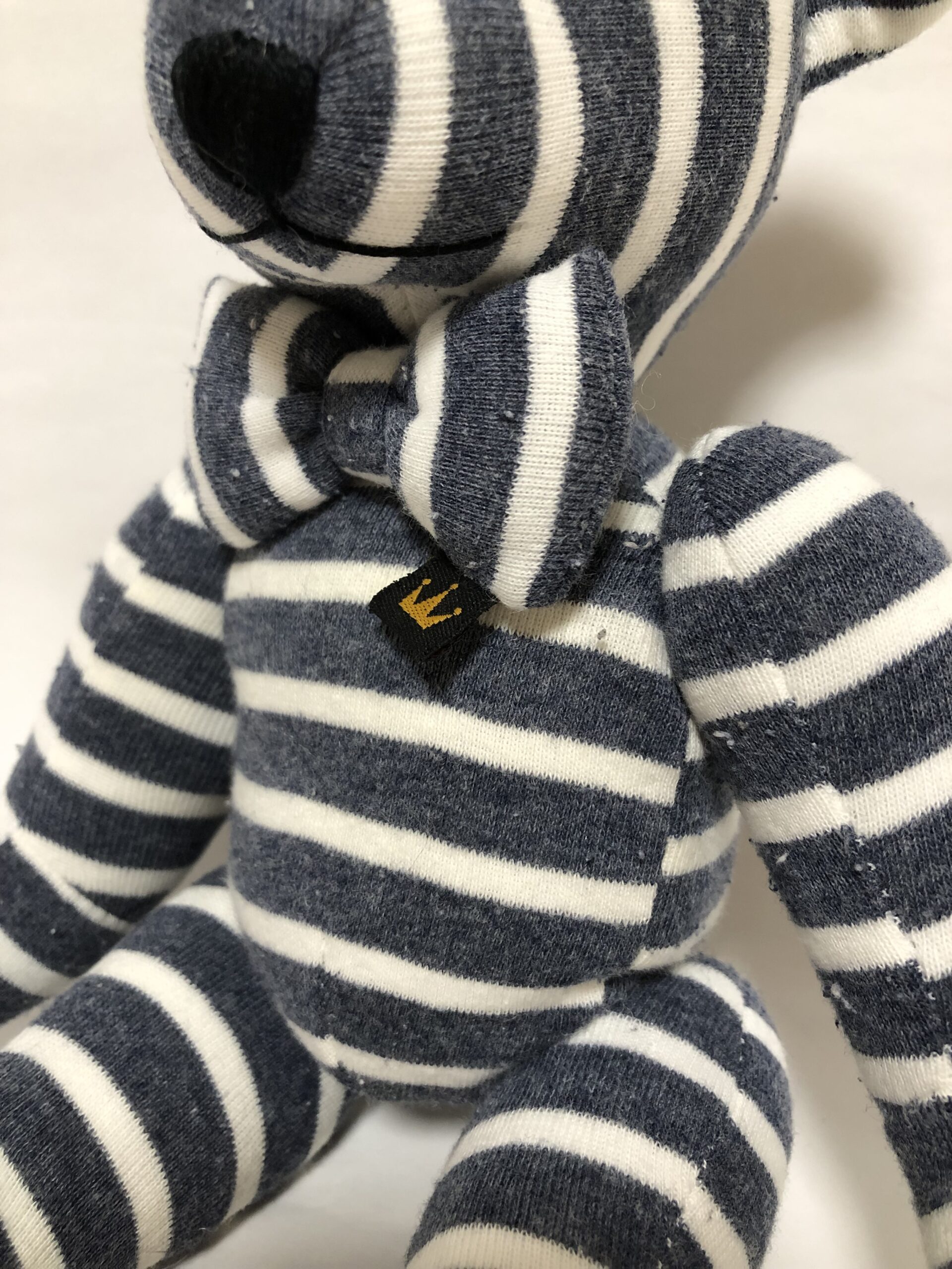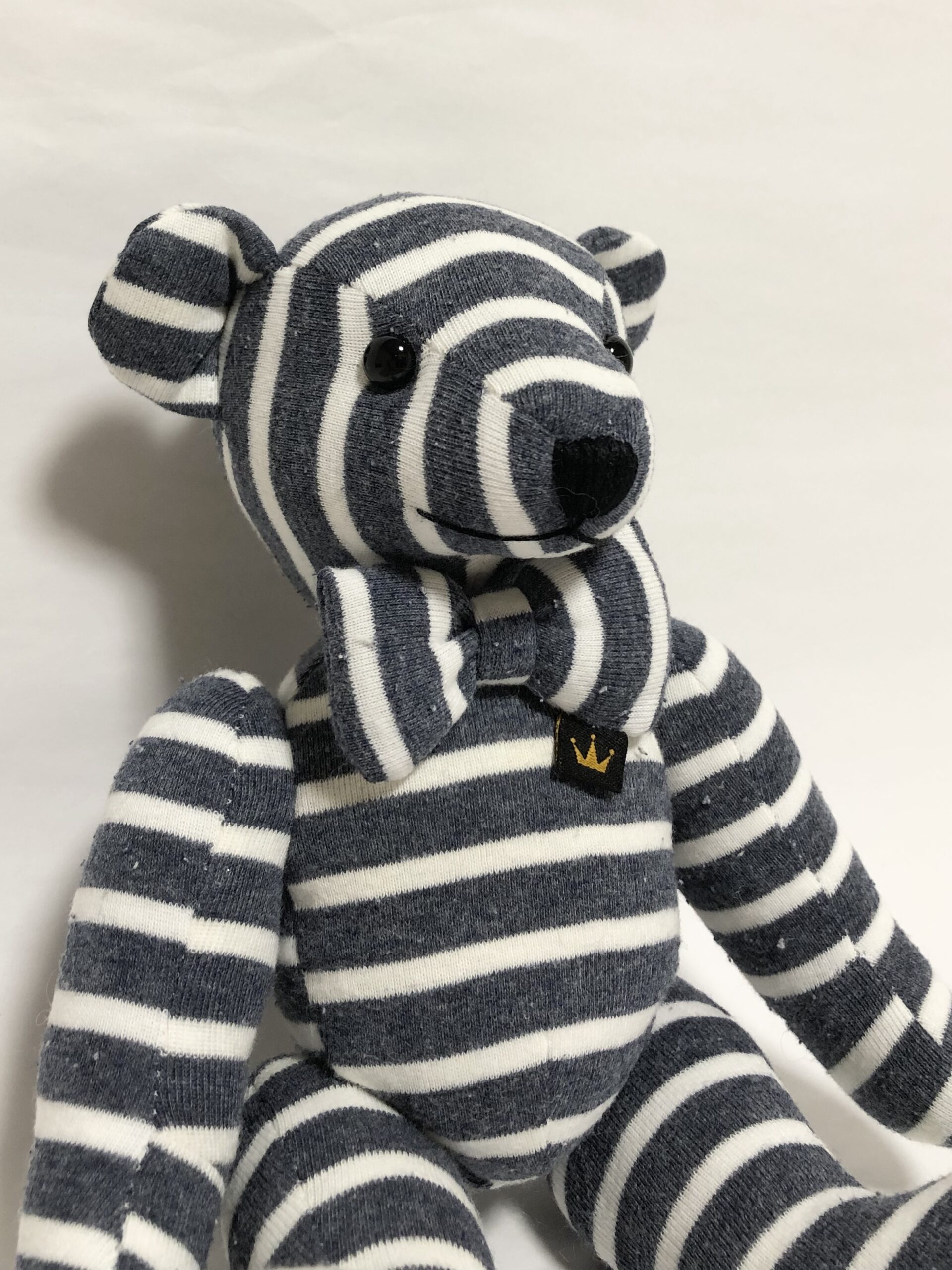 着用していた頃の思い出が特によく表れている衿周りの雰囲気を活かし、テディベアの蝶ネクタイにはベビー服の衿についていたタグをあしらっています。