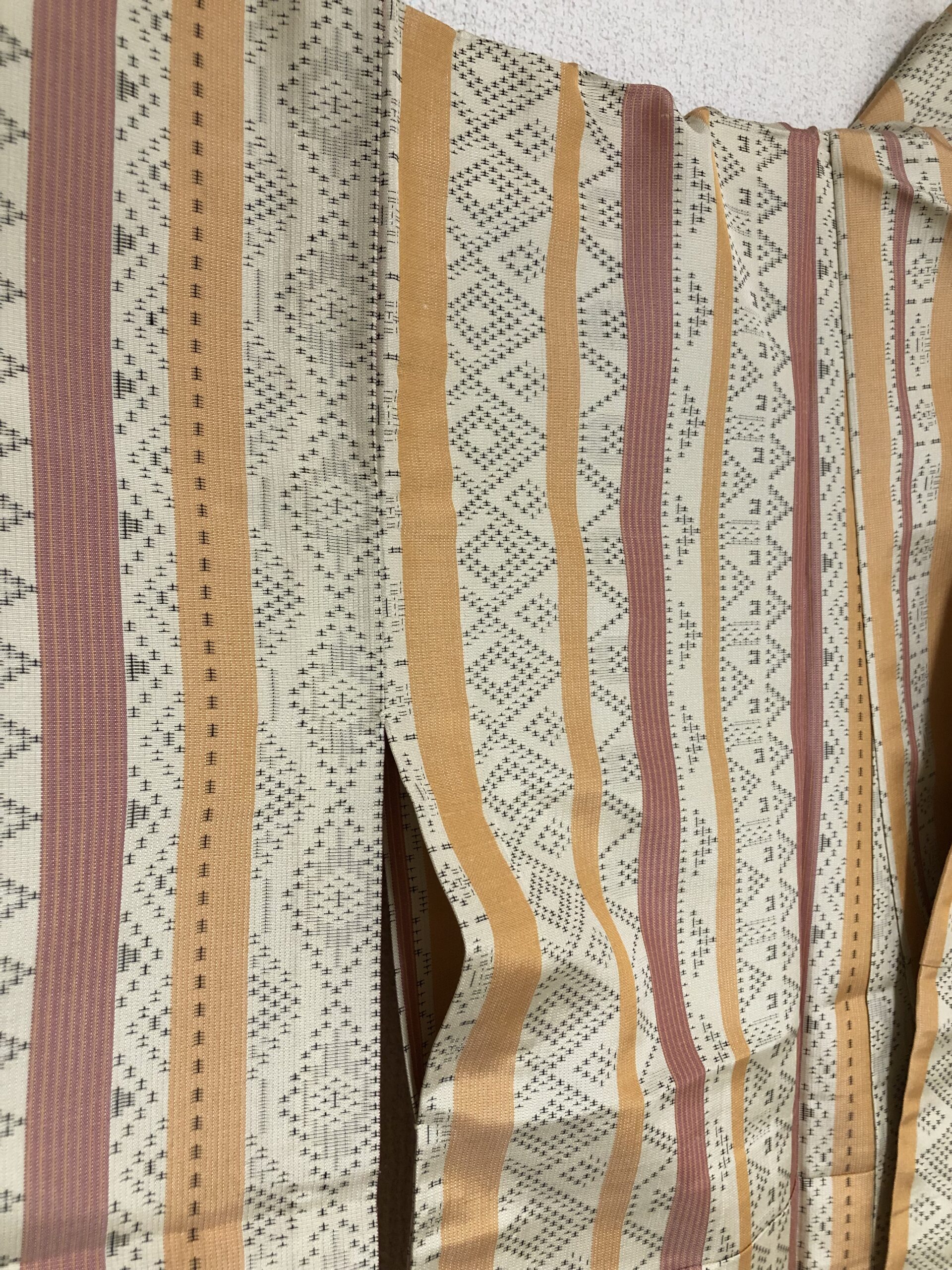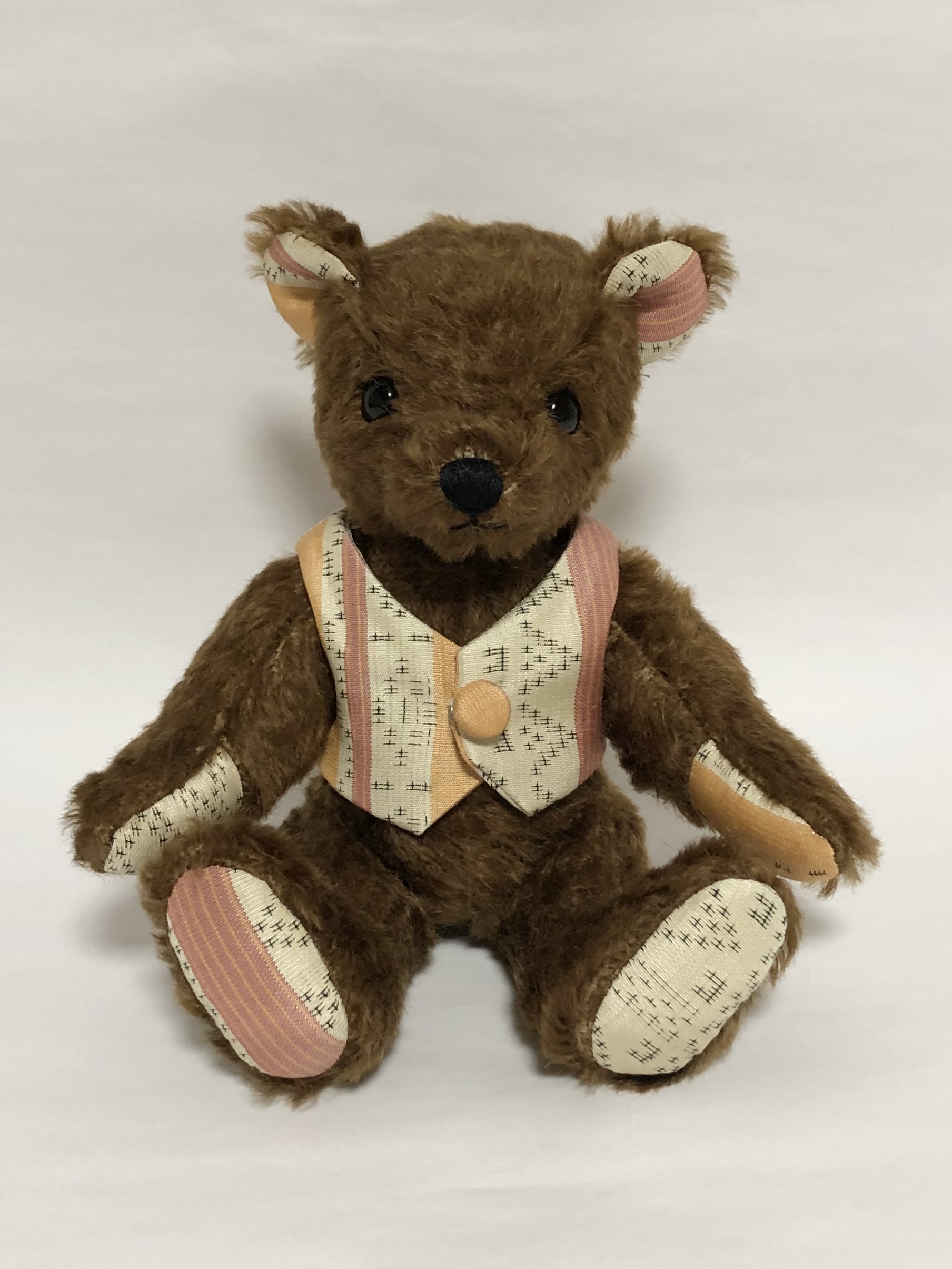 手足パッドやベストにあしらわれた着物地の暖かみある色合いや幾何学的な模様の美しさが、上質なテディベアの雰囲気によく合います。