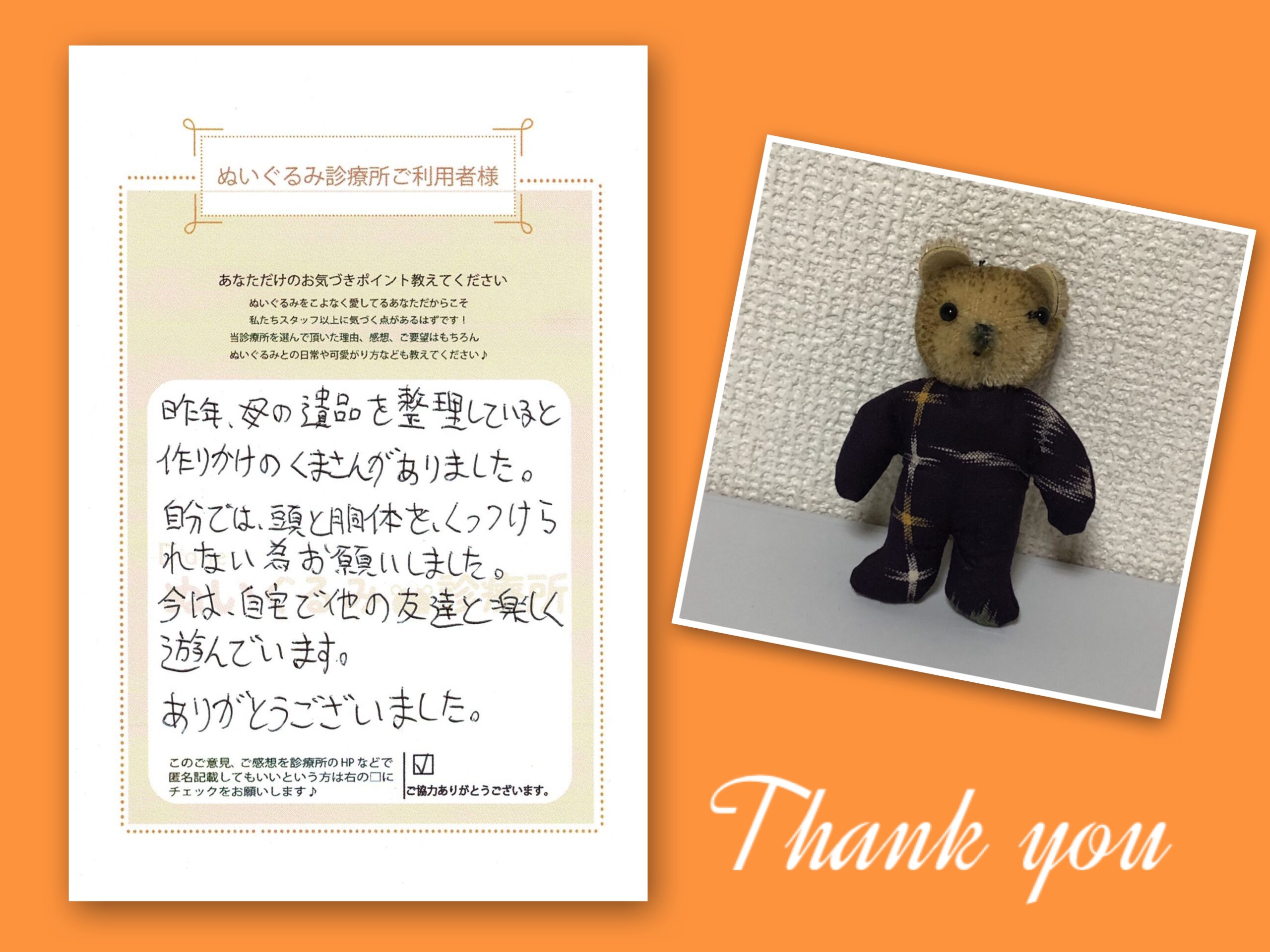 お客様の声 2025年 12月9日 今は、自宅で他の友達と楽しく遊んでいます。 [ くまさん ]昨年、母の遺品を整理していると 作りかけのくまさんがありました。 自分では、頭と胴体を、くっつけられない為お願いしました。 今は、自宅で他の友達と楽しく遊んでいます。 ありがとうございました。 くまさんの診療実績はこちら « 安心しておまかせする事ができました。 受け取った時の息子の笑顔を見て、治療を頼んで良かったと思いました。 »