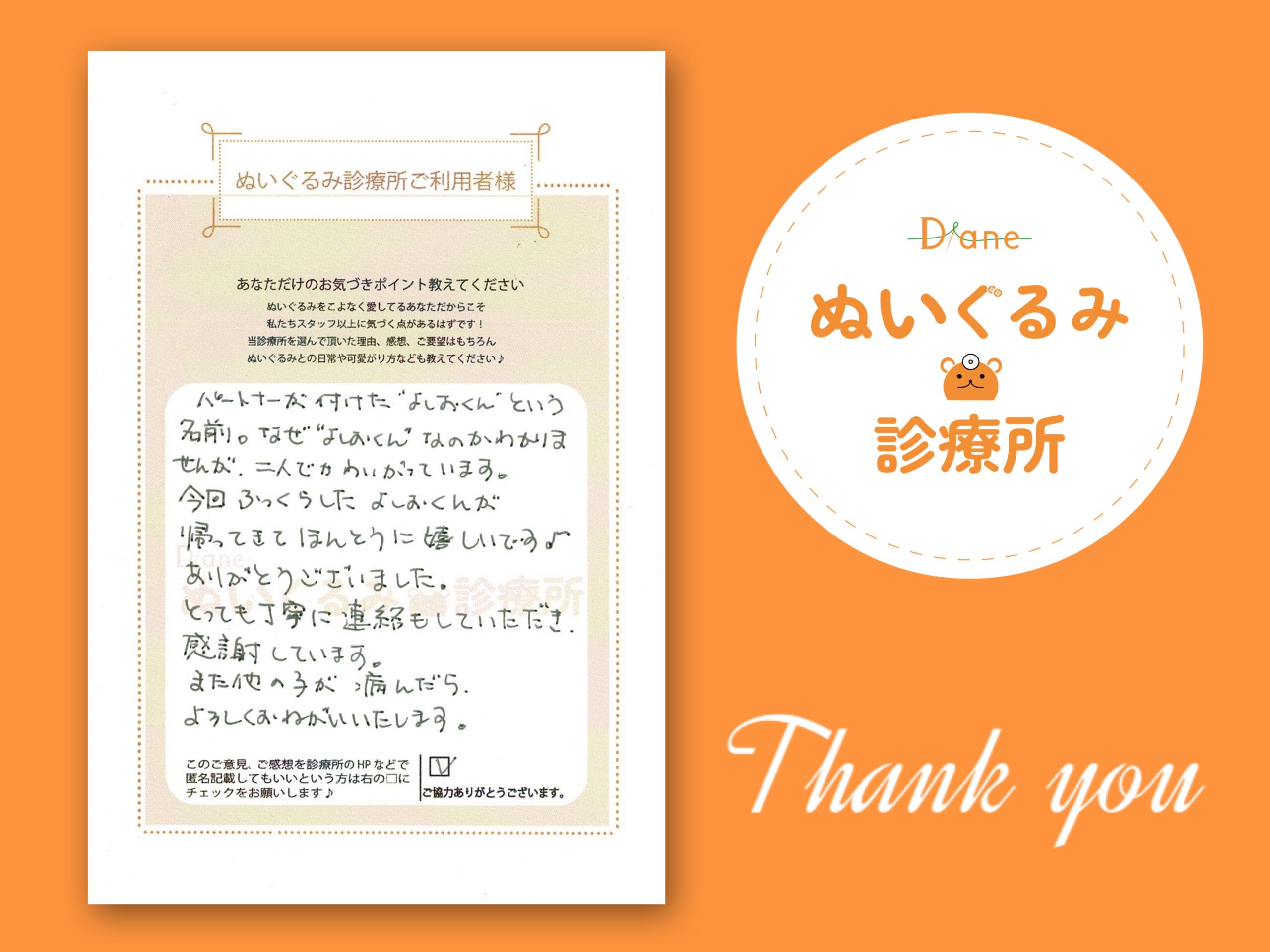 お客様の声 2025年 12月10日 とっても丁寧に連絡もしていただき、感謝しています。 [ よしおくん ]パートナーが付けた“よしおくん”という名前。なぜ“よしおくん”なのかわかりませんが、二人でかわいがっています。 今回ふっくらしたよしおくんが帰ってきて ほんとうに嬉しいです♪ありがとうございました。 とっても丁寧に連絡もしていただき、感謝しています。 また他の子が病んだら、よろしくお願いいたします。 « リピートでの利用です。入院する子1人1人に向き合ってくれるような温かい診療所様と感じたので、今回は、別の子の治療をお願いしました。 我が子のようなぬいぐるみがある方、ぜひ皆入院をおすすめします♪ »