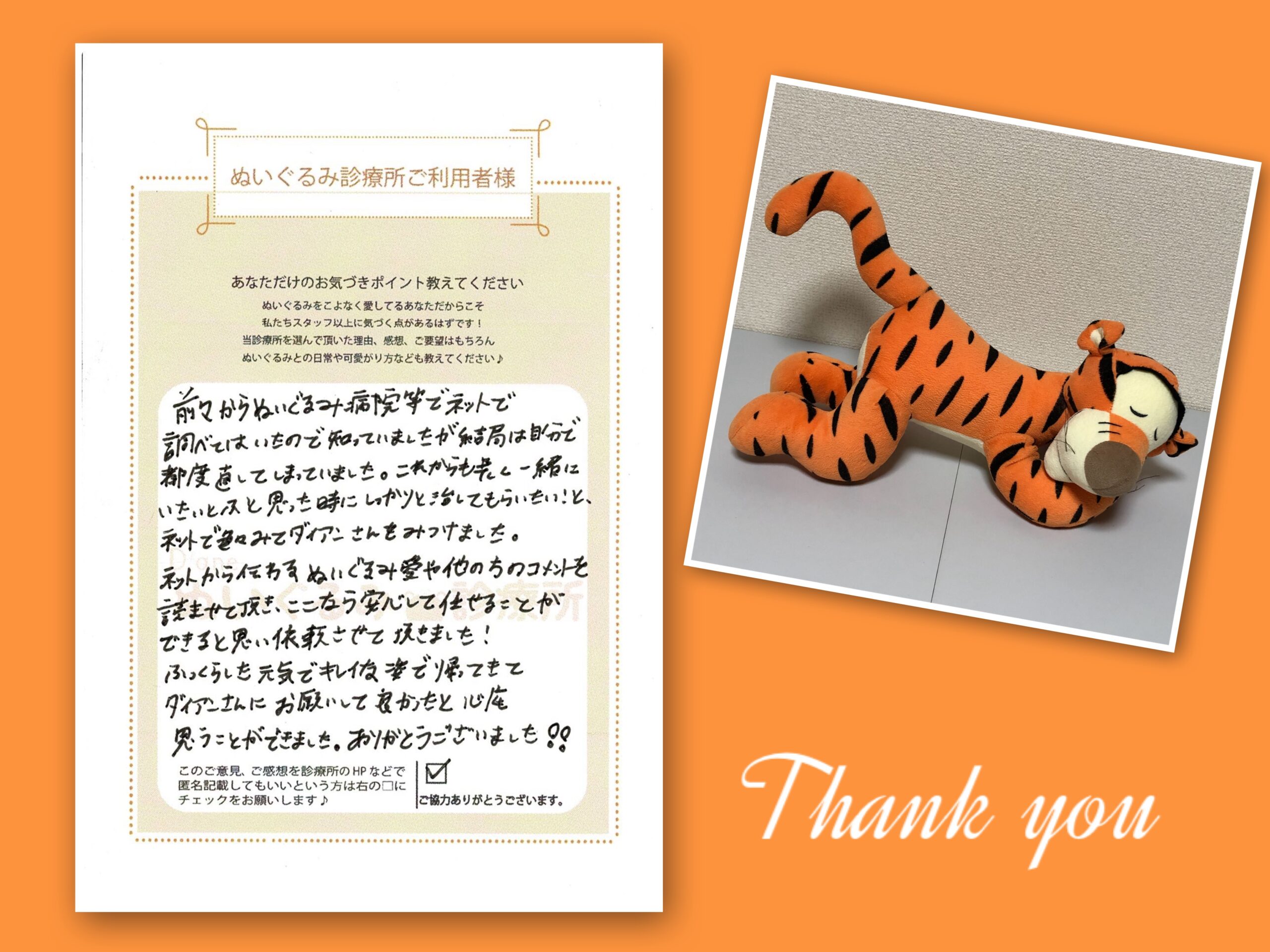 前々からぬいぐるみ病院等でネットで調べてはいたので知っていましたが 結局は自分で都度直してしまっていました。これからも長く一緒にいたいとふと思った時に しっかりと治してもらいたい!とネットで色々みてダイアンさんを見つけました。