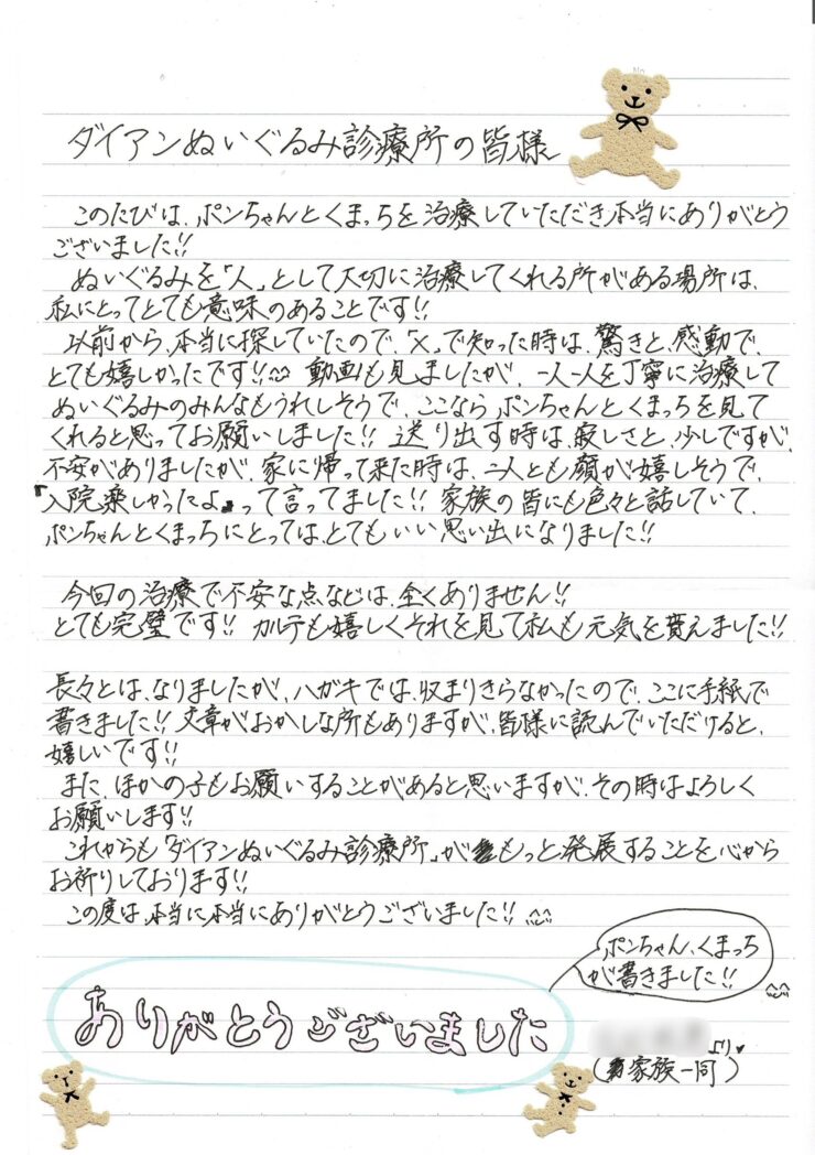 このたびは、ポンちゃん、くまっちを治療していただき本当にありがとうございます!!以前からぬいぐるみを治療してくれる所を探しておりまして、Xにて知り、とてもうれしく今回お願いしました!